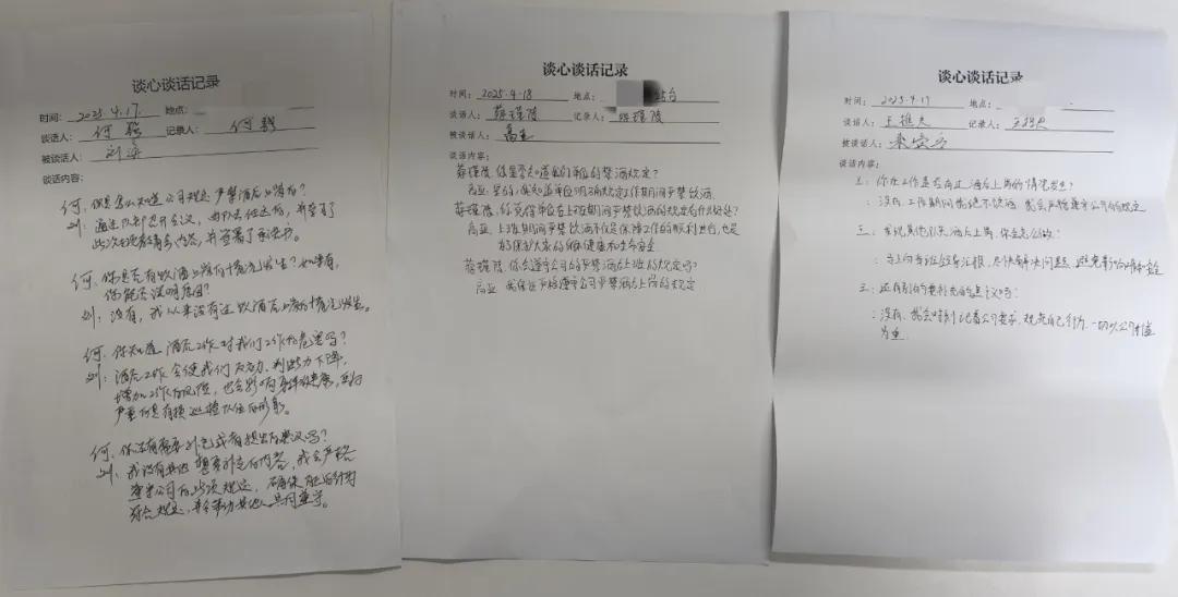 公司各部門組織開展全覆蓋式涉酒等風(fēng)險(xiǎn)隱患排查,通過“一對(duì)一”談話、“面對(duì)面”提醒等方式,深入排查重點(diǎn)人員、關(guān)鍵環(huán)節(jié),確保風(fēng)險(xiǎn)隱患無遺漏、無死角。